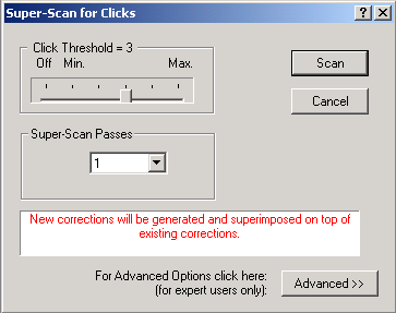 The command is similar to 'Re-Scan Clicks' except that the original corrections are not removed before re-scanning, the new corrections being superimposed upon the existing corrections.