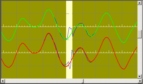 The green and red traces represents the corrected wave. Both traces are overlaid on top of the uncorrected wave, which is displayed in blue. Because the traces are overlaid, the blue trace is only visible where a correction has taken place. This enables corrections to be easily identified. The light yellow band at the centre indicates the width of a selected click as estimated by Wave Corrector.