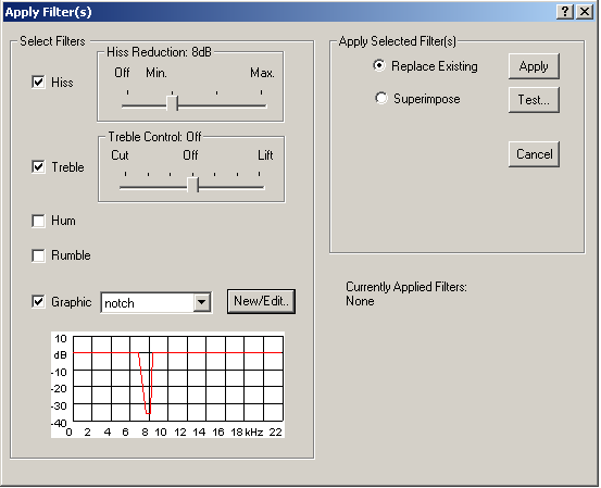 - Apply Digital Filters. Apply any combination of hiss, hum or rumble filters and/or apply a tonal correction filter to the recorded waveform. The hiss and hum filters use the principle of 'noise subtraction' to remove continuous noise without affecting the frequency response of the recording.